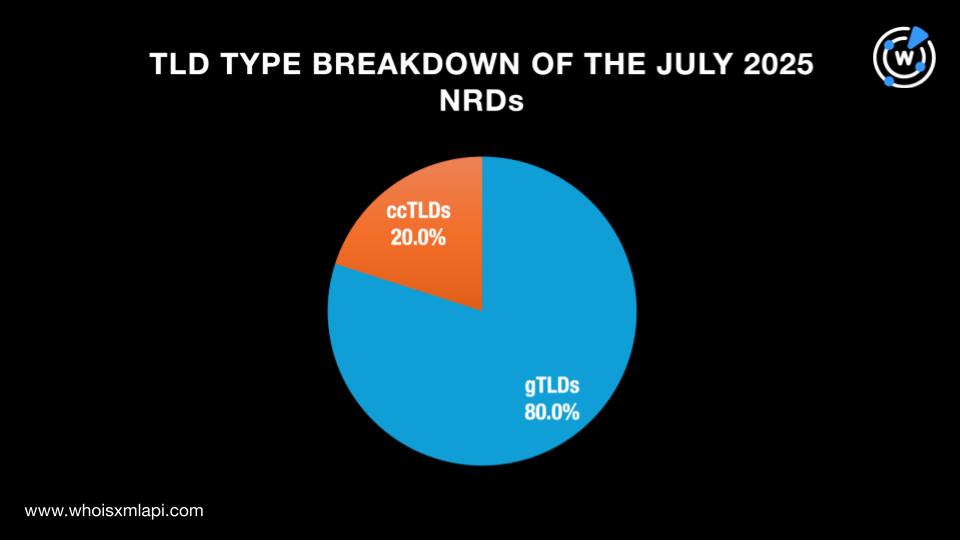 在 2025 年 7 月注册的 830 万多个域名中,80.0% 使用通用顶级域(gTLD),剩余 20.0% 使用国家代码顶级域(ccTLD)。