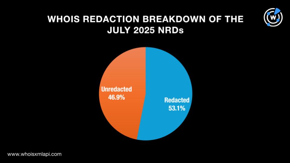2025 年 7 月,更多新注册域名(NRD)的 WHOIS 记录被编辑,占比 53.1%;未编辑的记录仅占 46.9%。
