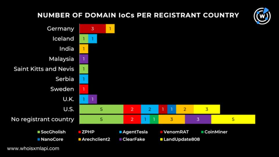 在对这49个被标记为 IoC 的域名进行更深入分析时,发现其中20个域名没有注册国家记录,其余29个域名分布在9个国家。其中,美国位居首位,占16个域名;德国以4个域名位居第二;冰岛和英国各有2个域名;印度、马来西亚、圣基茨和尼维斯、塞尔维亚、瑞典则各有1个域名。