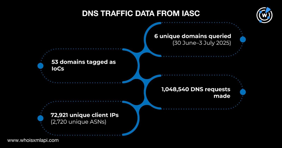 我们还参考了 Internet Abuse Signal Collective (IASC) 上的部分DNS流量数据,对这53个被标记为 IoC 的域名进行了进一步分析。样本数据显示,在2025年6月30日至7月3日期间,共有72,921个唯一客户端 IP 地址,隶属于2,720个唯一ASN,通过 1,048,540 次DNS 请求查询到了6个不同的域名。