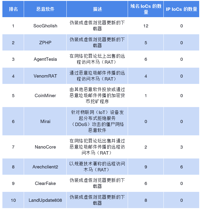 报告共识别出涉及其中九种恶意软件的62个IoC,其中包括53个域名和9个IP地址。具体分布如下: