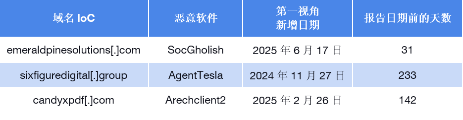 最后,我们在“第一视角”上对这53个IoC域名进行了查询,结果发现,其中7个域名在 2025 年7月18日被报告为攻击 IoC 之前31–233天就已出现在不同的数据源中。以下为三个示例。