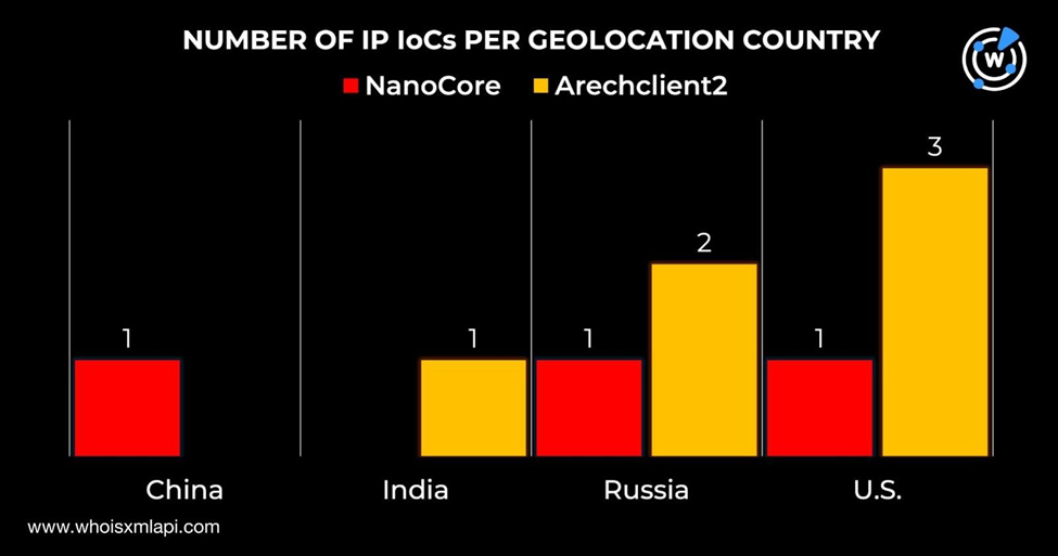 随后,我们在“批量IP地理定位查询”上搜索了与 NanoCore 和 Arechclient2 相关的 9 个被标记为 IoC 的 IP 地址。查询结果显示,这些 IP 地址分布在4个国家:其中美国位居首位,占 4 个 IP 地址;俄罗斯以 3 个 IP地址排名第二;中国和印度则各有 1 个 IP 地址。