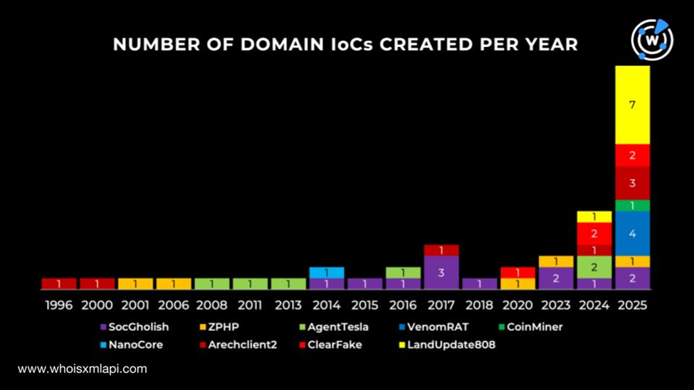 我们对 2025 年第二季度排名前十的恶意软件中九种的 WHOIS 和 DNS 足迹 进行了更深入的分析,发现了 25,633 个关联信息,包括: