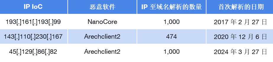 通过DNS大事记API查询这9个被标记为 IoC 的 IP地址,结果显示只有7个IP地址存在历史的 IP 到域名解析记录。具体来看,这7个IP地址自2017年2月4日 起,共记录了3,704条解析记录。以下是其中3个IP地址的详细信息: