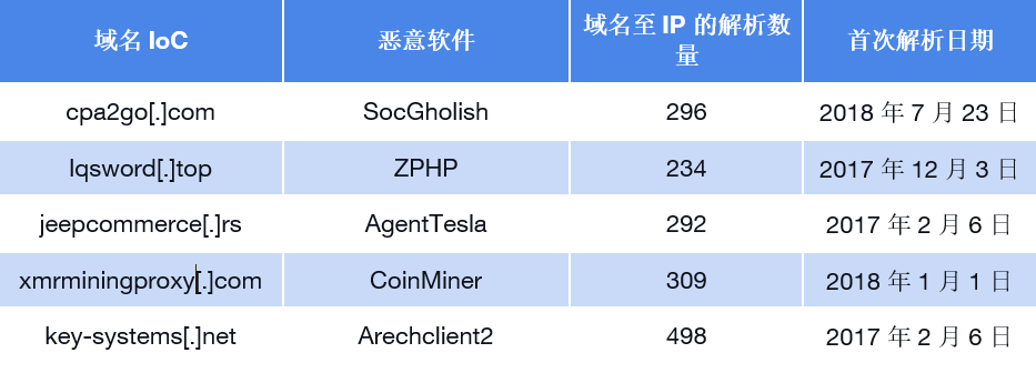 随后,我们通过“ DNS大事记API”查询了这 53 个被标记为 IoC 的域名,结果发现只有 50 个域名存在历史 DNS 解析记录。具体如下,这50个域名自 2017 年 2 月 5 日 起共产生了 8,472 条域名到 IP 的解析记录。其中,有7个域名共享这一最早的解析日期。在这7个域名中,SocGholish 和 NanoCore 各关联了 2 个域名;而AgentTesla、Arechclient2和 LandUpdate808 则各关联了1个域名。以下是关于其中5个域名的细节信息: