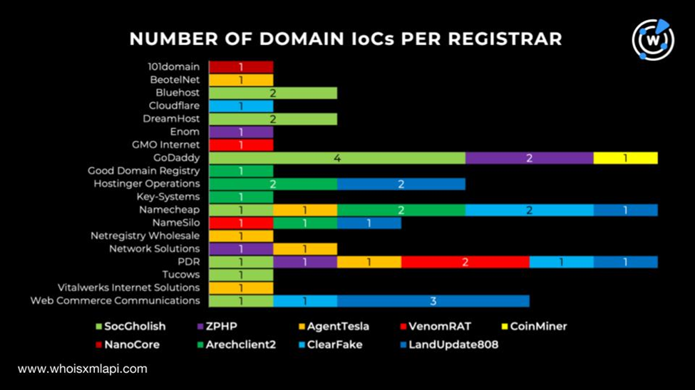 对这49个被标记为 IoC 的域名注册商进一步分析发现,GoDaddy、Namecheap 和 PDR 位居前列,各占7个域名。Web Commerce Communications 以5个域名位居第二,Hostinger Operations 以4个域名排名第三。NameSilo 以3个域名排名第四。Bluehost、DreamHost 和 Network Solutions 各有2个域名,并列第五。最后,101domain、BeotelNet、Cloudflare、Enom、GMO Internet、Good Domain Registry、Key-Systems、Netregistry Wholesale、Tucows 以及 Vitalwerks Internet Solutions 各有1个域名,构成了完整名单。下图为分解情况。