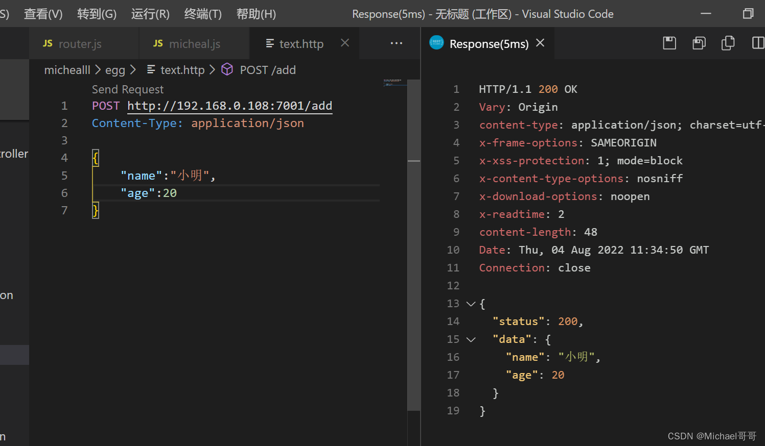 路由是描述请求URL和具体承担执行动作的Controller的对应。说的直白点,就是用户访问不同的路径时应该有不同的Controller去响应不同的内容。(egg的默认端口号是7001)