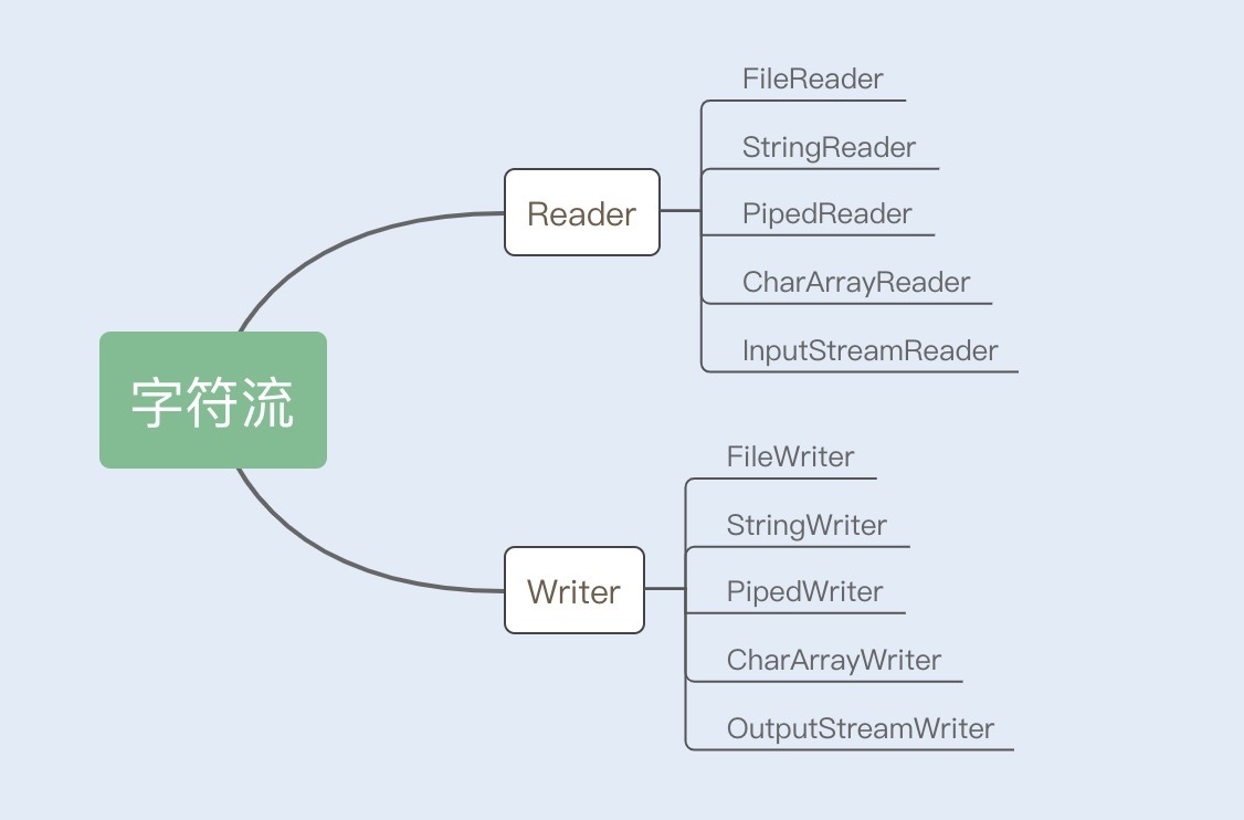 Reader/Writer 是字符流的抽象类,这两个抽象类也派生出了若干子类,不同的子类分别处理不同的操作类型,具体内容如下图所示: