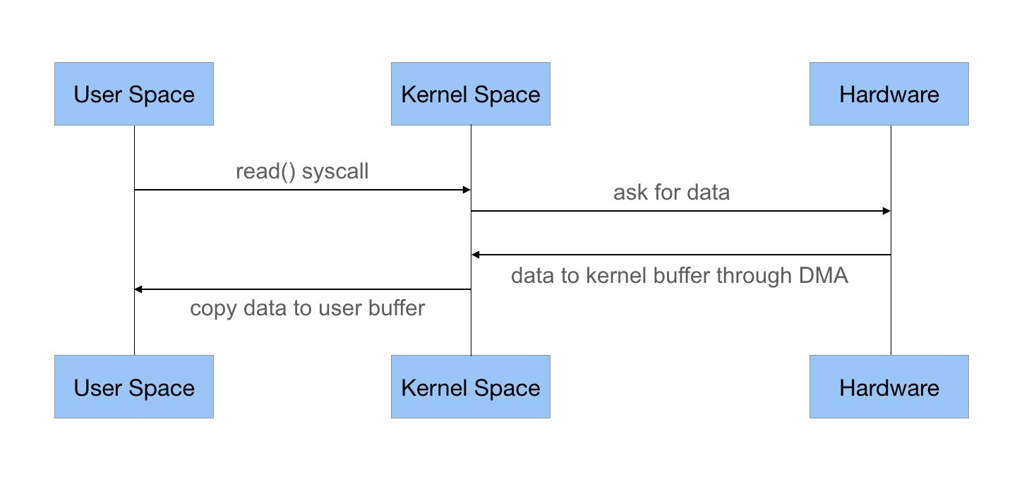 在这个过程中,数据先从外部设备复制到内核空间,再从内核空间复制到用户空间,这就发生了两次内存复制操作。这种操作会导致不必要的数据拷贝和上下文切换,从而降低 I/O 的性能。