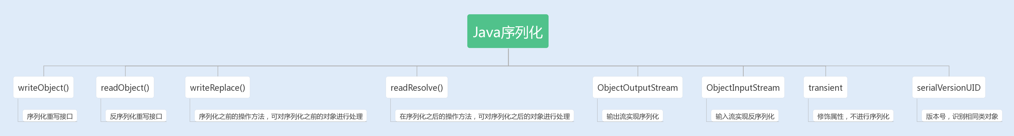 另外,Java 序列化的类中还定义了两个重写方法:writeReplace() 和 readResolve(),前者是用来在序列化之前替换序列化对象的,后者是用来在反序列化之后对返回对象进行处理的。