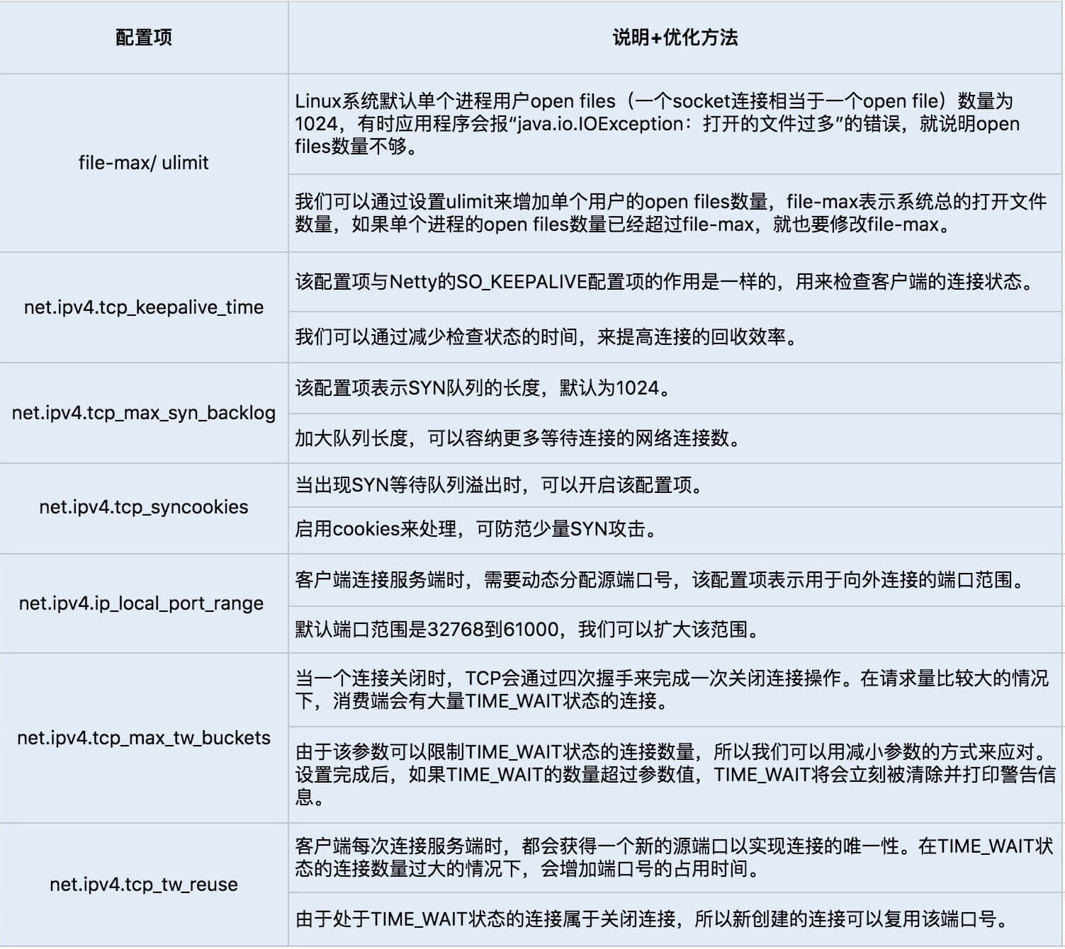 除了以上这些优化,我们还可以针对套接字编程提供的一些 TCP 参数配置项,提高网络吞吐量,Netty 可以基于 ChannelOption 来设置这些参数。