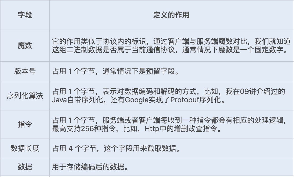 在 09 讲中,我们分析过序列化编码和解码的过程,对于实现一个好的网络通信协议来说,兼容优秀的序列化框架是非常重要的。如果只是单纯的数据对象传输,我们可以选择性能相对较好的 Protobuf 序列化,有利于提高网络通信的性能。