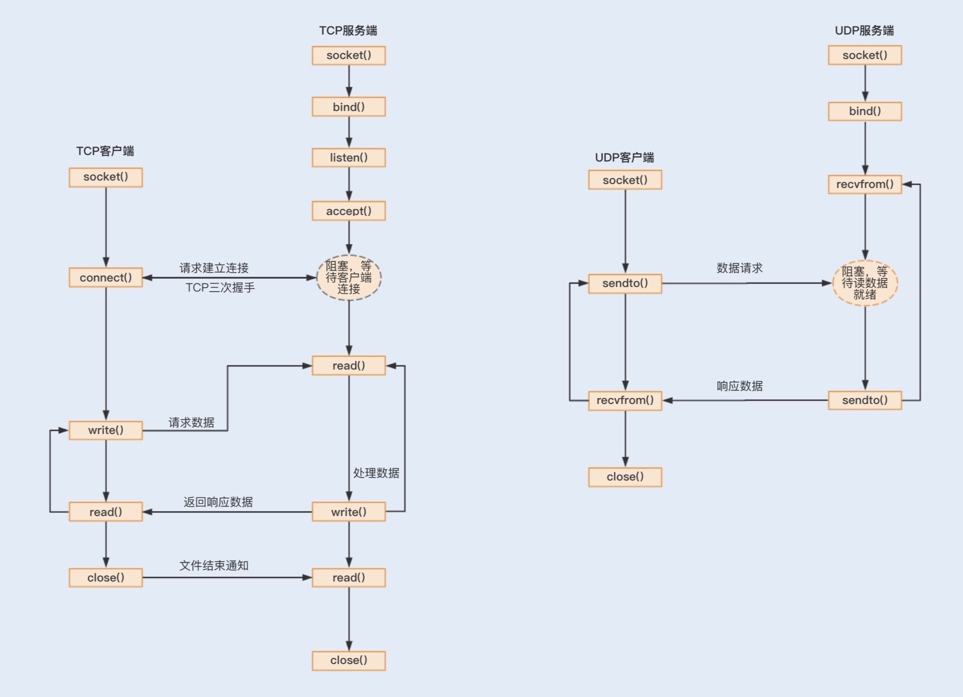 要实现不同机器间的网络通信,我们先要了解计算机系统网络通信的基本原理。网络通信是两台设备之间实现数据流交换的过程,是基于网络传输协议和传输数据的编解码来实现的。其中网络传输协议有 TCP、UDP 协议,这两个协议都是基于 Socket 编程接口之上,为某类应用场景而扩展出的传输协议。通过以下两张图,我们可以大概了解到基于 TCP 和 UDP 协议实现的 Socket 网络通信是怎样的一个流程。