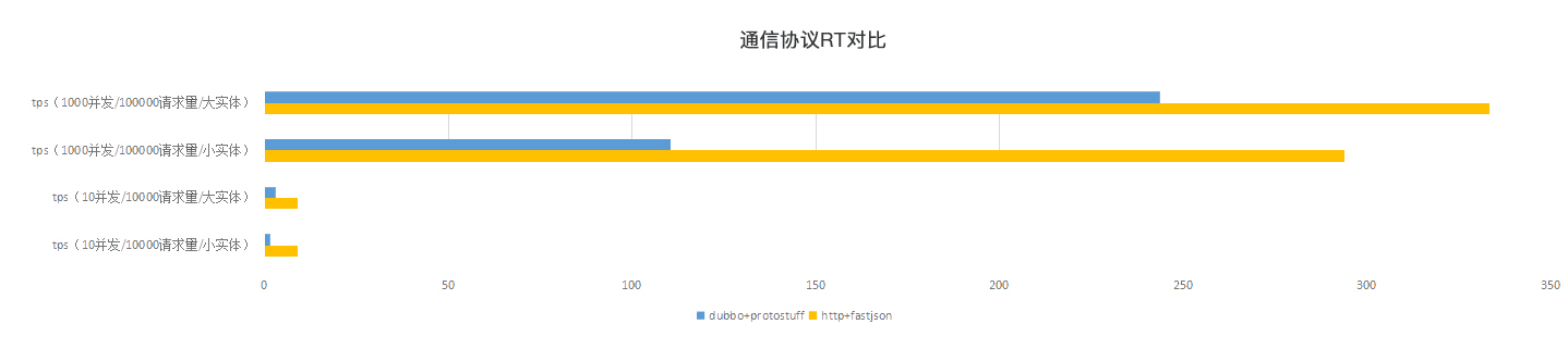以下是基于 Dubbo:2.6.4 版本进行的简单的性能测试。分别测试 Dubbo+Protobuf 序列化以及 Http+Json 序列化的通信性能(这里主要模拟单一 TCP 长连接 +Protobuf 序列化和短连接的 Http+Json 序列化的性能对比)。为了验证在数据量不同的情况下二者的性能表现,我分别准备了小对象和大对象的性能压测,通过这样的方式我们也可以间接地了解下二者在 RPC 通信方面的水平。