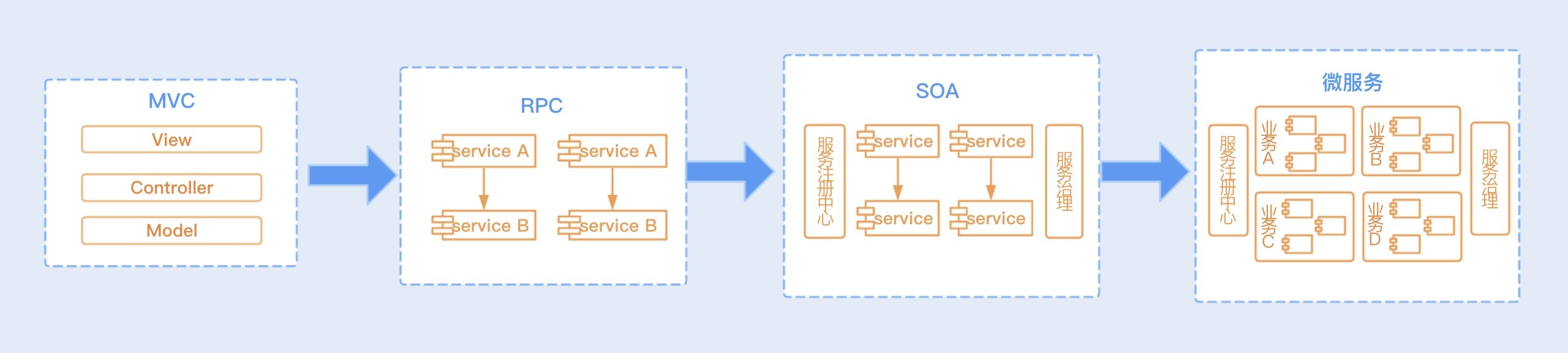 一提到 RPC,你是否还想到 MVC、SOA 这些概念呢?如果你没有经历过这些架构的演变,这些概念就很容易混淆。你可以通过下面这张图来了解下这些架构的演变史。