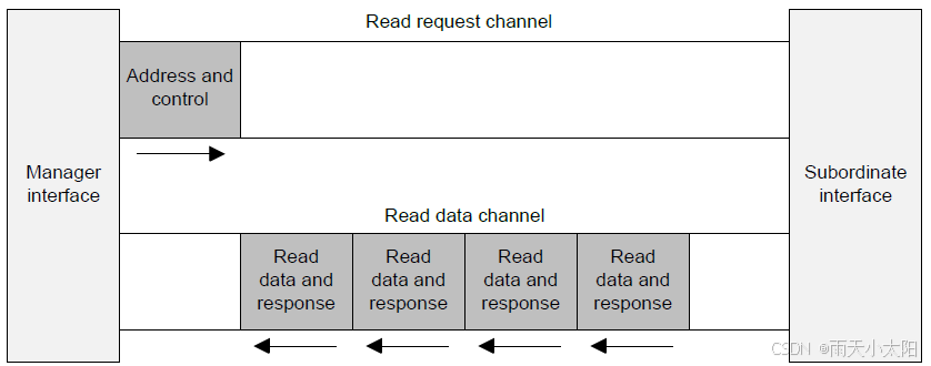 读事务如下图所示,主机通过读请求通道将读控制信息发送至从机,从机通过读数据通道将数据发送至从机。如何让主机知道读的数据是否正确呢?由于数据和响应信号传输方向一致,从机可以将读响应信号和数据一起通过读数据通道发送至主机,不需要专用的读相应通道。