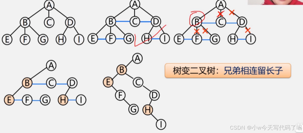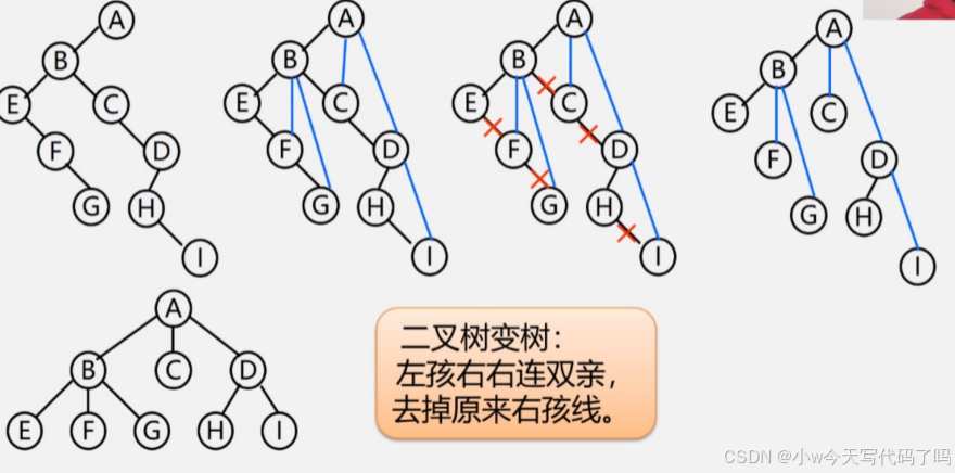 a)加线:在兄弟间加一条线。b)抹线:对每个结点,除了左孩子,去除其与其余孩子之间的关系