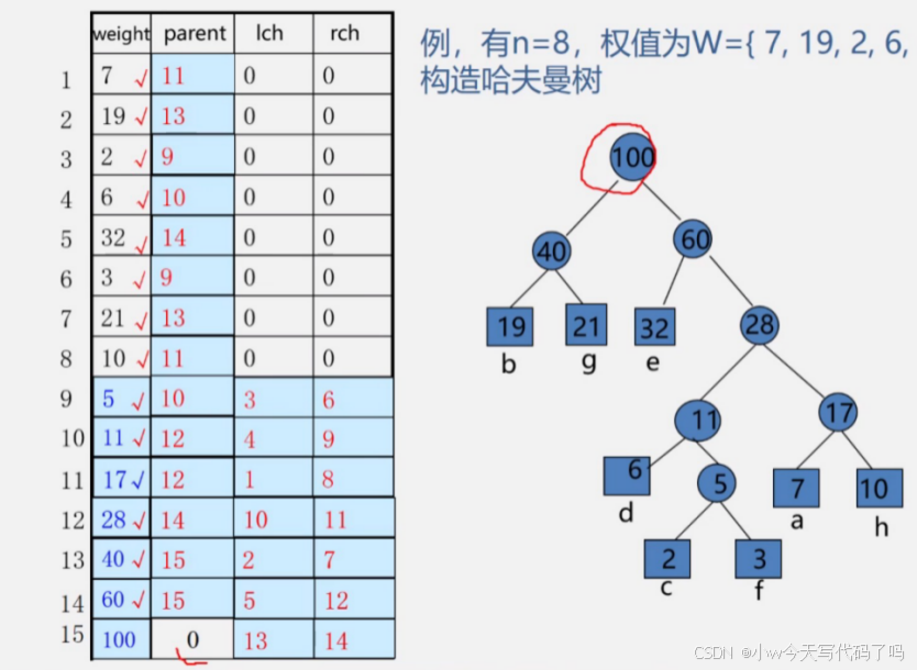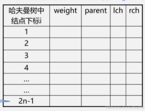 哈夫曼树共有2n-1个结点,不使用0下标,数组大小为2n