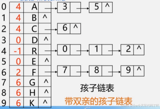 (1)双亲表示法:定义结构数组,存放树的结点,每个结点含两个域:数据域和双亲域