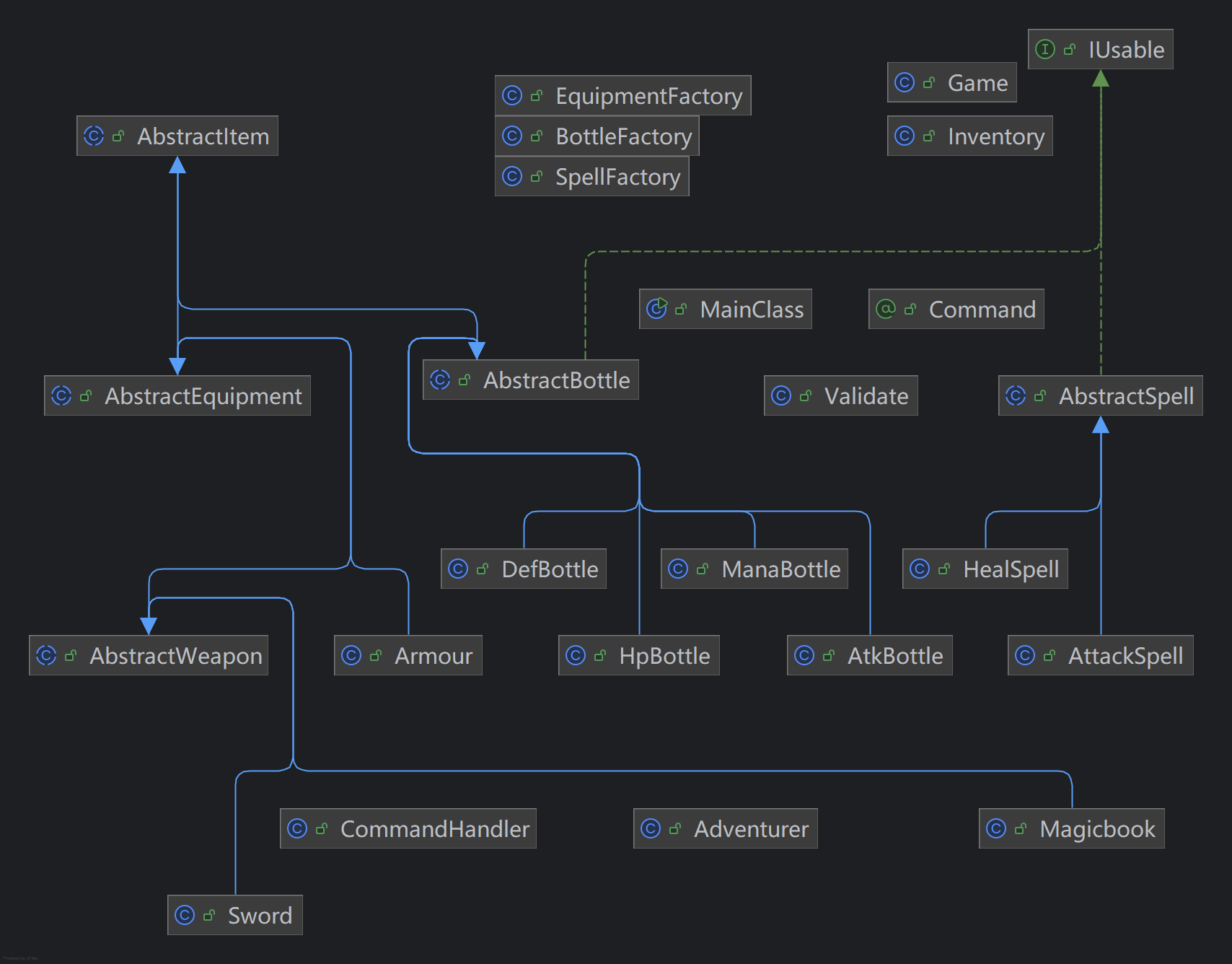 采用了自顶向下的设计法。通过CommandHandler类控制所有的指令,控制Game实例。实际上,由于最开始的时候架构设计比较好,后期架构并没有过多的调整。唯一的较大调整就是添加了单独的背包类来控制每个冒险者拥有和携带的物品。