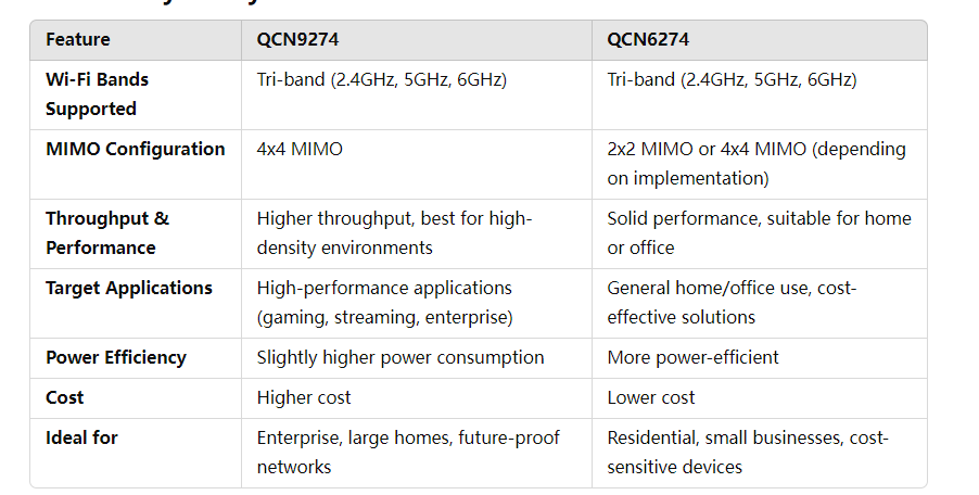 The more advanced feature set of the QCN9274—tri-band support, 4x4 MIMO, and future-proofing with the 6GHz band—may result in slightly higher power consumption and cost compared to the QCN6274.