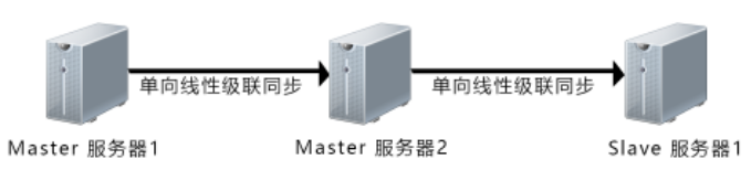 下图为线性级联单向双主复制逻辑架构图,此架构只能在 Master1 端进行数据写入,工作场景中,Master1 和 Master2 作为主主互备,Slave1 作为从库,中间的 Master2 需要做特殊的设置。