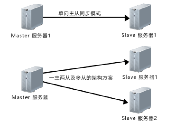下图为单向主从复制架构逻辑图,此架构只能在 Master 端进行数据写入: