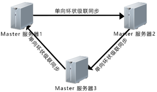 下图为环状级联单向多主同步逻辑架构图,任意一个点都可以写入数据,此架构比较复杂,属于极端环境下的“作品”,一般场景应慎用。