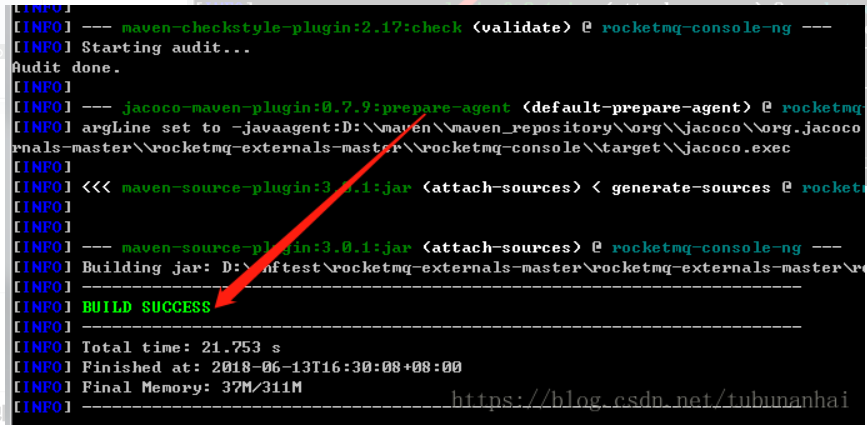 编译需用maven命令进行编译,如下图,显示BIUD SUCCESS,则编译成功,成功后会在rocketmq-externals-master/rocketmq-console/target目录下产生一个rocketmq-console-ng-1.0.0.jar文件。