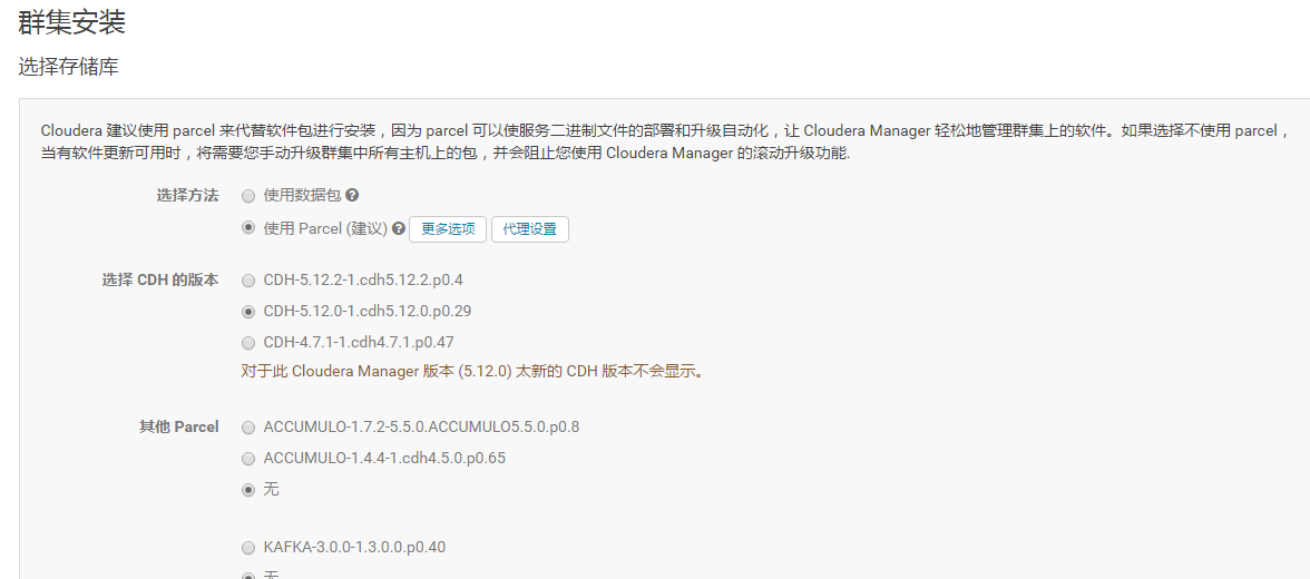 这一步,需要选择安装CDH的方式,有两种方式,使用数据包和使用Parcel,如果服务器已经使用数据包安装了CDH,则这里不能再选择使用Parcel,两者无法同时使用,建议选择Parcel。