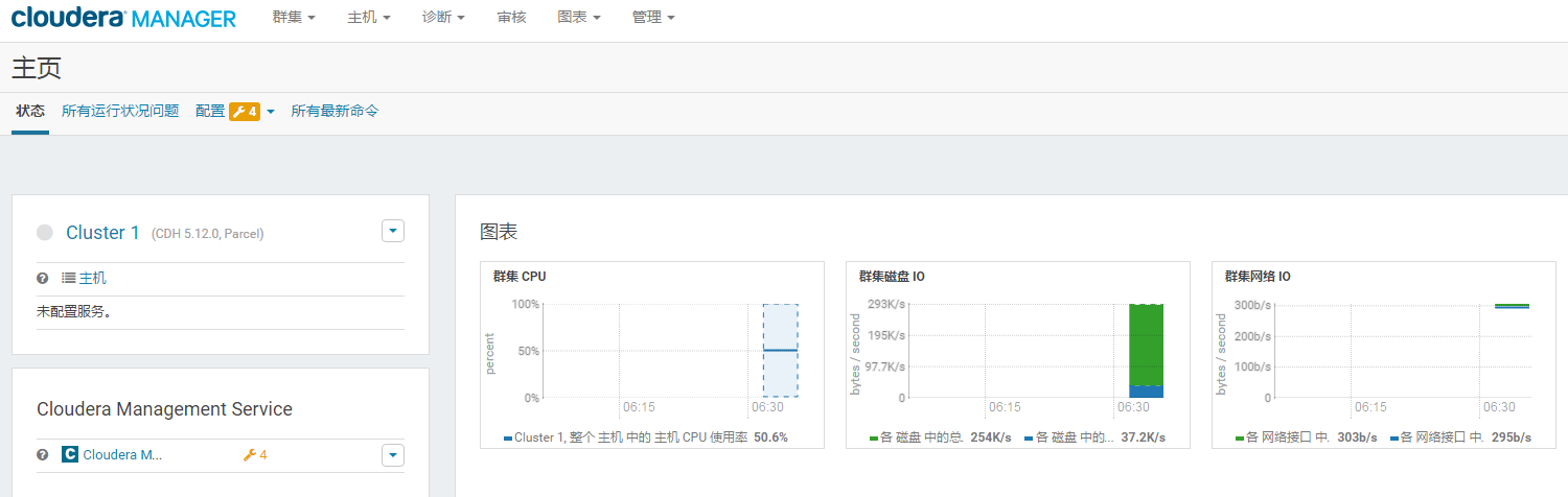 在没有添加Cloudera Manager Service时,首页可能会报错,比如无法连接Host Monitor等,启动该服务成功,等待一段时间,所有服务准备就绪,首页正常,如下图1.23所示: