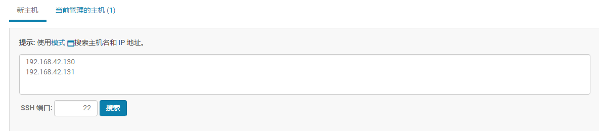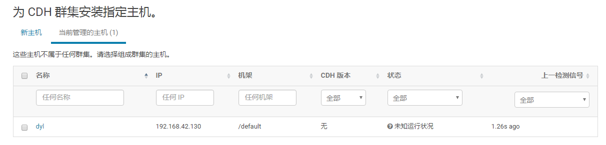 这一步,有两个选项卡,如果没有提前手动安装和启动Cloudera Manager Agent,则选择“新主机”,填入主机名,Cloudera Manager Server自动搜索能够免密登录的主机,然后在其上自动安装Cloudera Manager Agent。由于已经安装和启动了Cloudera Manager Agent,并且成功启动,这里选择“当前管理的主机”,就能够直接看到启动了Cloudera Manager Agent的主机,勾选上即可。如果“当前管理的主机”显示的不完全,同样可以使用新主机进行搜索。如下图1.15所示: