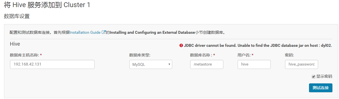 如上图1.30所示,无法找到jdbc驱动程序,操作和6.4.2.3中相同,“dyl02”服务器上传mysql-connector-java.jar到/usr/share/java中,Cloudera Manager Agent默认加载该目录下jar包。再次点击“测试连接”,显示成功,点击“继续”,显示配置hive目录和端口的界面,点击“继续”,开始部署并启动hive,如下图1.31所示:
