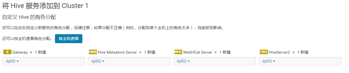 如上图1.25所示,点击“添加服务”,选择Hive,进入Hive配置界面,首先选择主机,如下图1.29所示: