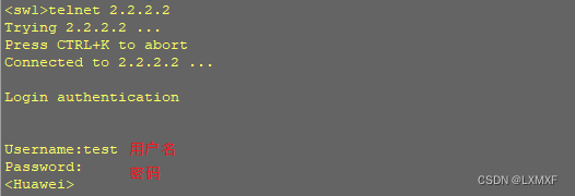 在上述配置完成后,可以在交换机上输入 <sw1>telnet 2.2.2.2 测试Telnet配置是否成功(华为ensp上的PC不支持Telnet,所以使用交换机替代)