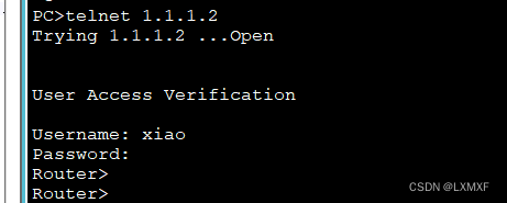 Router(config)#username xiao secret 321 创建用户名和登录密码