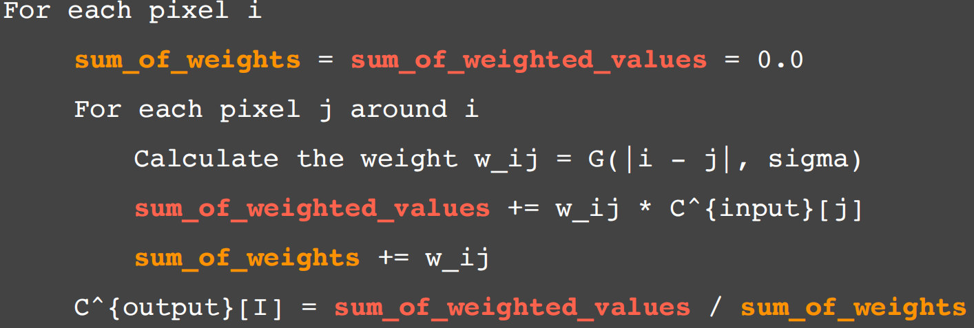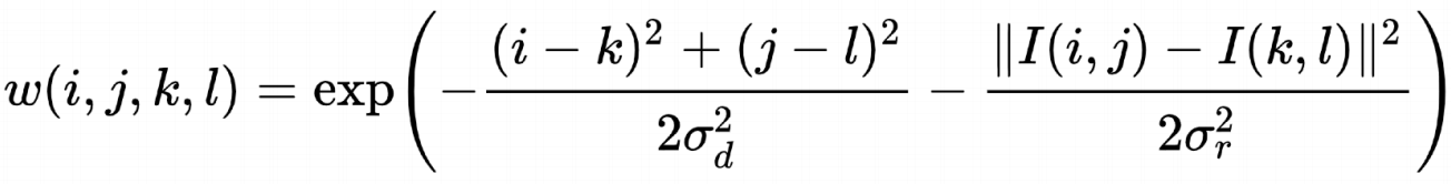 边界就是颜色急剧变化的位置,如果相邻像素颜色差别特别大,就不让它们起到贡献,于是修稿高斯滤波公式为: