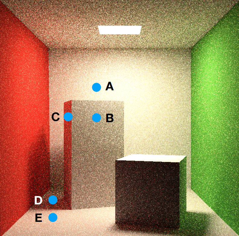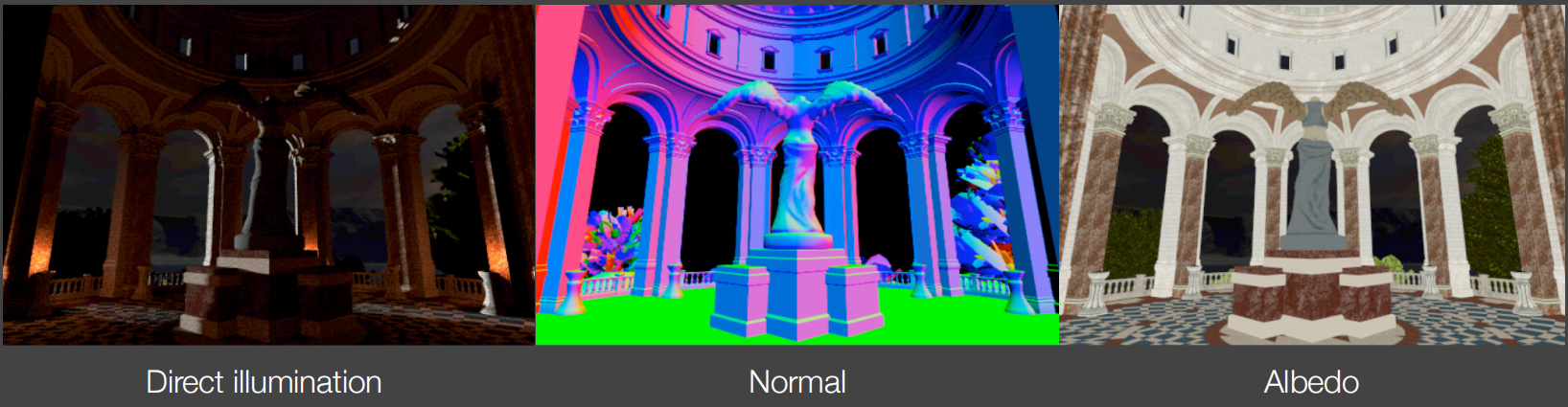 渲染过程中免费获取的辅助信息,包括直接光照信息、法线信息、漫反射颜色信息,分别保存在一张屏幕空间二维缓冲中。