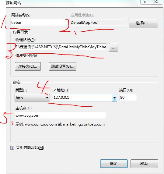五、右击左侧的 网站 选项,选择 添加网站,然后按下图所示的步骤操作