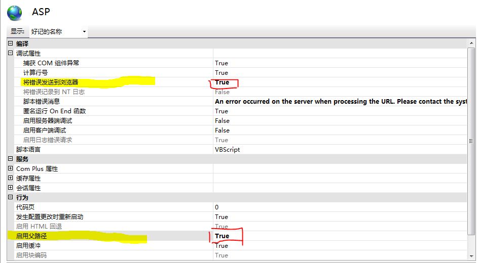 八、将调试属性下的 将错误发送到浏览器 属性改为 True 和 将 行为 下的 启用父路径 属性改为 True