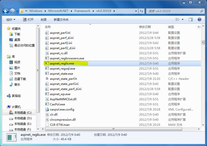 三、打开C:\Windows\Microsoft.NET\Framework\v4.0.30319的文件目录将文件 aspnet_regiis.exe 拖到cmd命令行工具进行安装