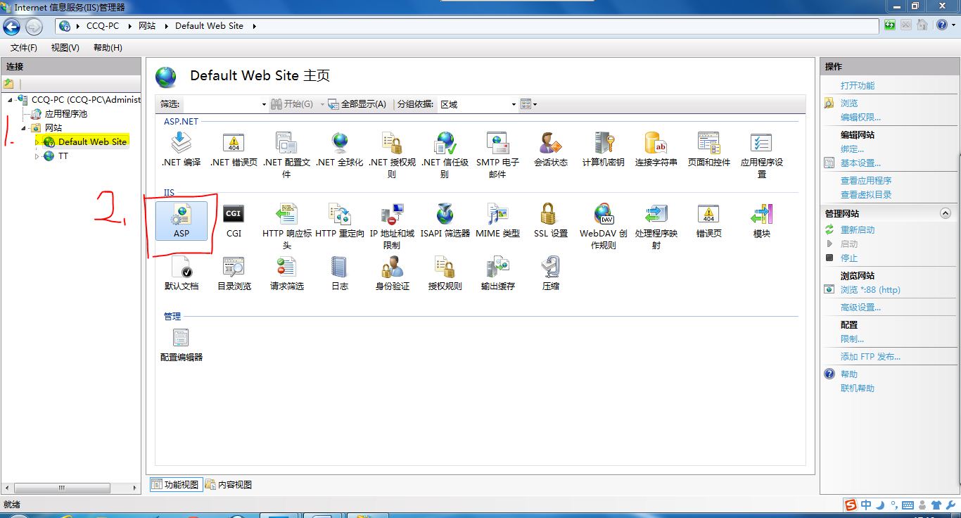 七、选中左侧 网站选项的子选项 Default Web Site 然后双击列表中的ASP选项