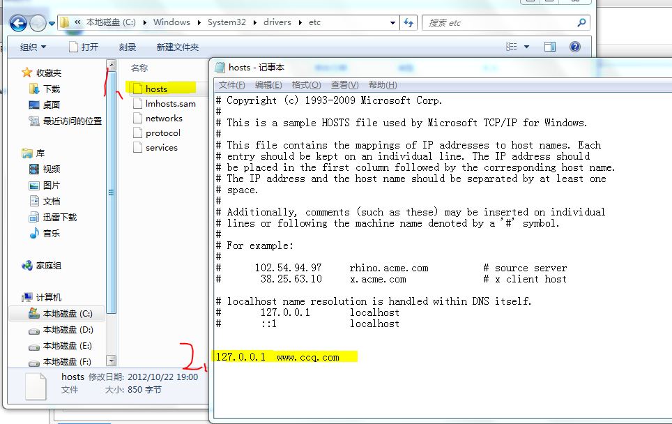 六、如果是要在本机模拟部署网站的话,还要将C:\Windows\System32\drivers\etc目录下的 hosts 文件 以记事本方式打开,并在如下图所示的空白处,添加 你的本机IP地址和你要模拟绑定的网站域名