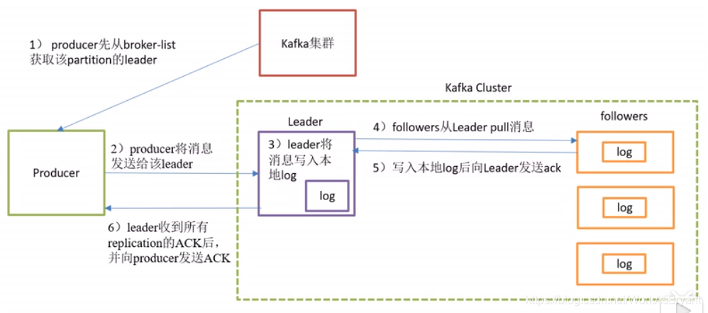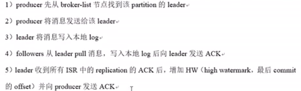 上述写入流程ACK应答机制取得值是ALL,也就是leader和follower全部都写完再向producer发送ACK信息(ACK还可取值为0或1)。文字总结如下: