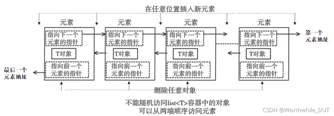 由于链表的存储方式并不是连续的内存空间,因此链表中的迭代器只支持前移和后移,属于双向迭代器。