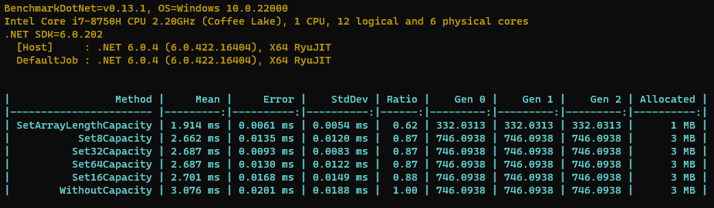 从这里大家就可以看出来,如果不指定初始大小的话,HashSet和Dictionary这样的数据结构扩容的成本更高,因为还需要ReHash这样的操作。