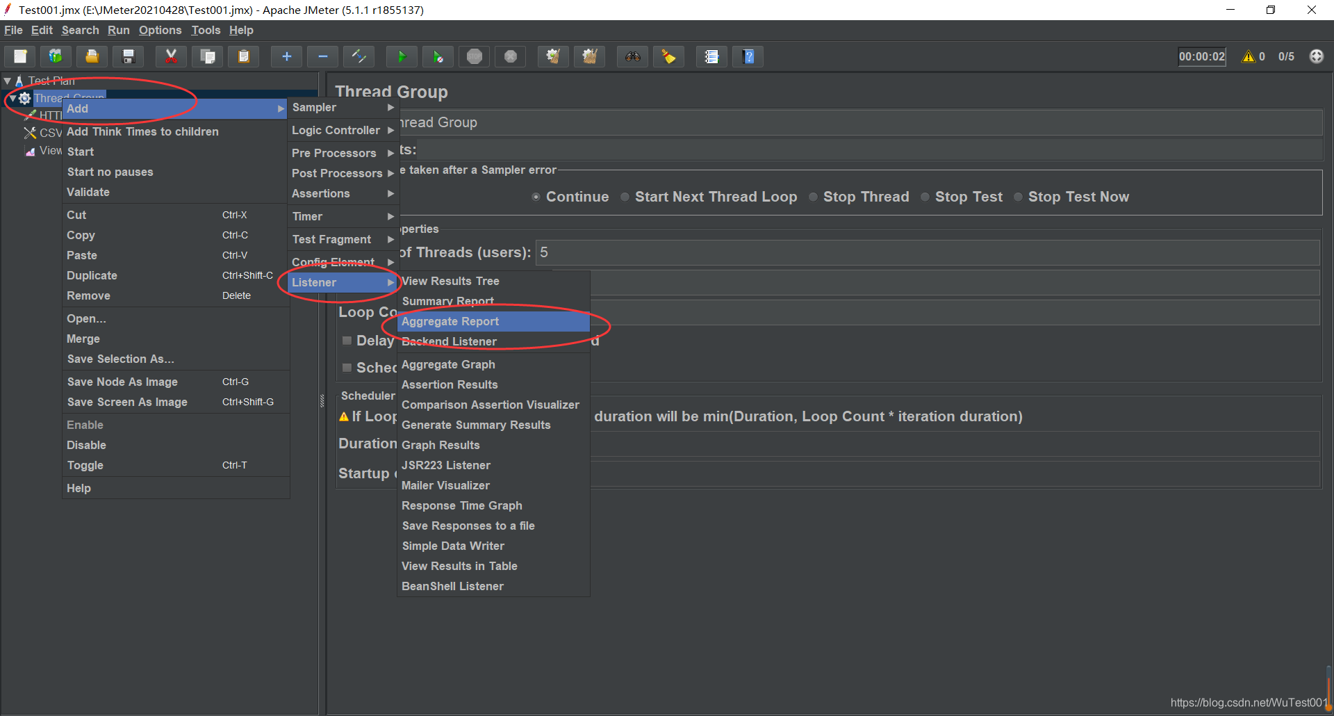 选择Thread Group,鼠标右键,选择【Thread Group->Add->Listener->Aggregate Report】,如图所示。