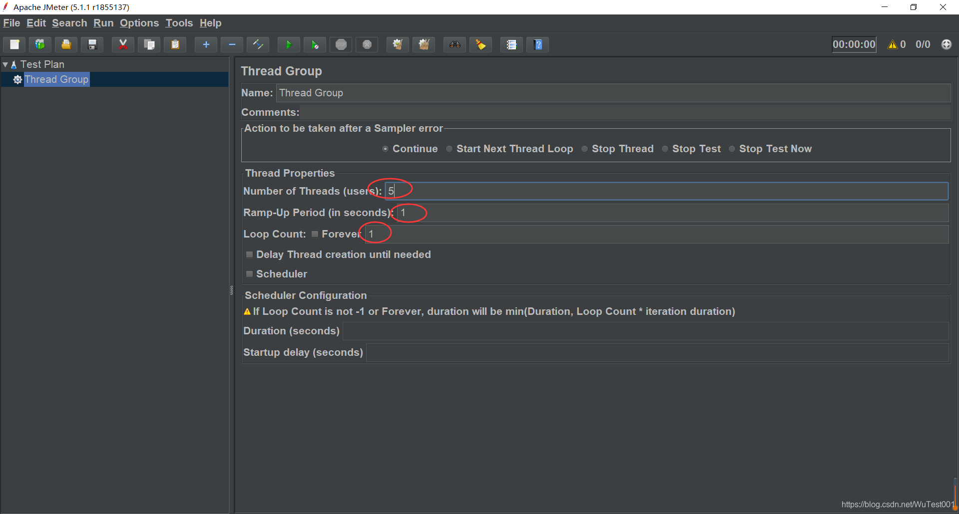 在测试计划中添加线程组,设置用户数量和循环次数,详细如下: