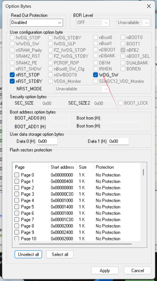 各种尝试后发现解锁芯片时这里没有勾选WDG_SW,选择了硬件看门狗,但是没有进行喂狗操作,所以导致芯片一直在重启。